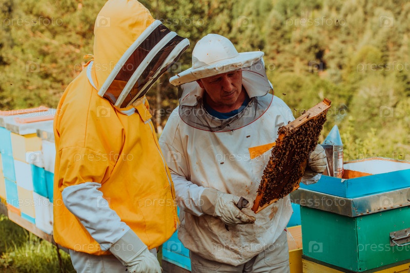 Пчеловоды проверяют мед на рамке улья в поле. Владельцы малого бизнеса на пасеке. Производитель натуральных здоровых продуктов питания работает с пчелами и ульями на пасеке