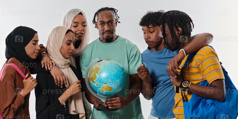 Разнообразная группа студентов собралась по всему миру, поглощенная исследованиями и учебой, их яркая энергия запечатлена на первозданном белом фоне, символизируя единство и любопытство в их образовательном путешествии
