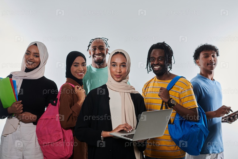 Группа разнообразных студентов занимается современными образовательными практиками, используя различные технологические инструменты, такие как ноутбуки, планшеты и смартфоны, на чистом белом фоне, иллюстрируя современный подход к совместному обучению и до