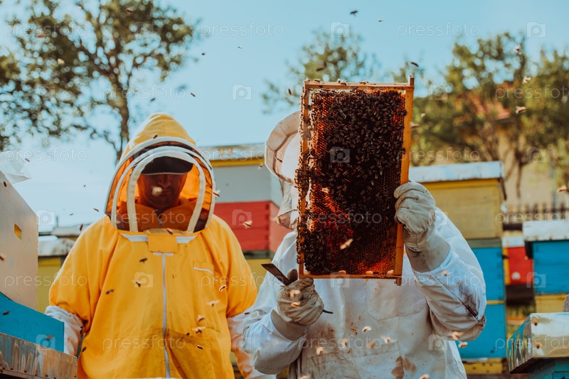 Пчеловоды проверяют мед на рамке улья в поле. Владельцы малого бизнеса на пасеке. Производитель натуральных здоровых продуктов питания работает с пчелами и ульями на пасеке