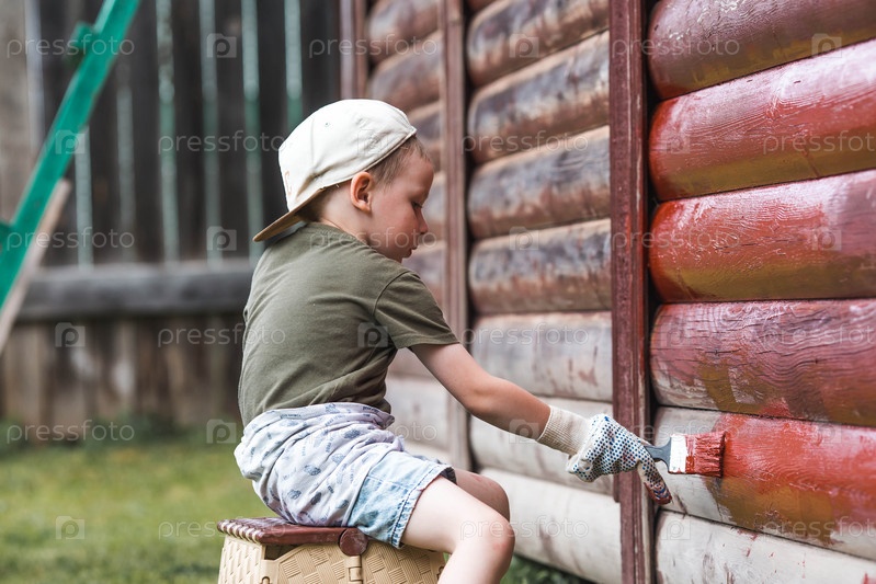 Маленький мальчик работает кистью и наносит красную краску на деревянный деревенский дом. Приучаем ребенка к работе. Половина окрашенной поверхности. Размазывание кистью