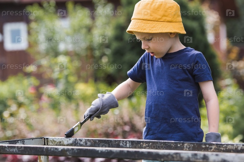 Маленький ребенок 5 лет работает кистью и наносит черную краску на ржавчину. Малыш красит металлические конструкции. Удаление ржавчины. Приучаем ребенка к работе