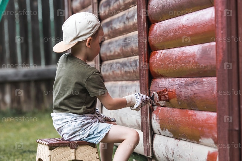 Маленький мальчик работает кистью и наносит красную краску на деревянный деревенский дом. Приучаем ребенка к работе. Половина окрашенной поверхности. Размазывание кистью