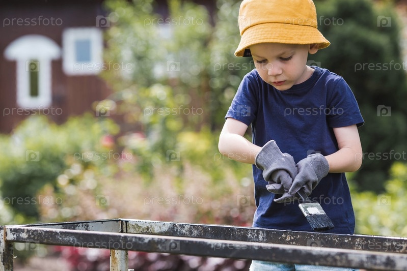 Маленький ребенок 5 лет работает кистью и наносит черную краску на ржавчину. Малыш красит металлические конструкции. Удаление ржавчины. Приучаем ребенка к работе