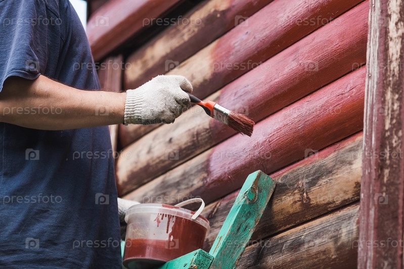 Мужчина работает кистью и наносит красную краску на деревянный деревенский дом. Рабочий красит деревянные доски крупным планом. Половина окрашенной поверхности. Размазывание кистью