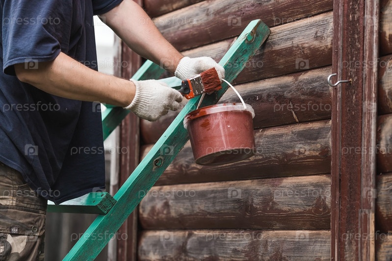 Мужчина работает кистью и наносит красную краску на деревянный деревенский дом. Рабочий красит деревянные доски крупным планом. Половина окрашенной поверхности. Размазывание кистью