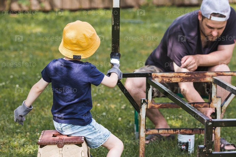 Отец и сын работают кистью и наносят черную краску на ржавчину. Люди красят металлические конструкции. Удаление ржавчины. Приучаем ребенка к работе