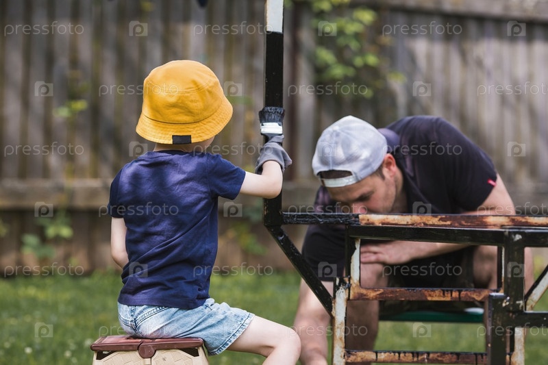 Отец и сын работают кистью и наносят черную краску на ржавчину. Люди красят металлические конструкции. Удаление ржавчины. Приучаем ребенка к работе