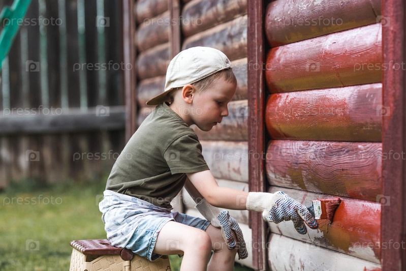 Маленький мальчик работает кистью и наносит красную краску на деревянный деревенский дом. Приучаем ребенка к работе. Половина окрашенной поверхности. Размазывание кистью