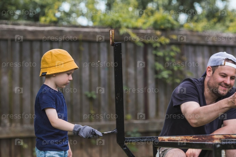 Отец и сын работают кистью и наносят черную краску на ржавчину. Люди красят металлические конструкции. Удаление ржавчины. Приучаем ребенка к работе