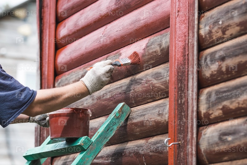 Мужчина работает кистью и наносит красную краску на деревянный деревенский дом. Рабочий красит деревянные доски крупным планом. Половина окрашенной поверхности. Размазывание кистью
