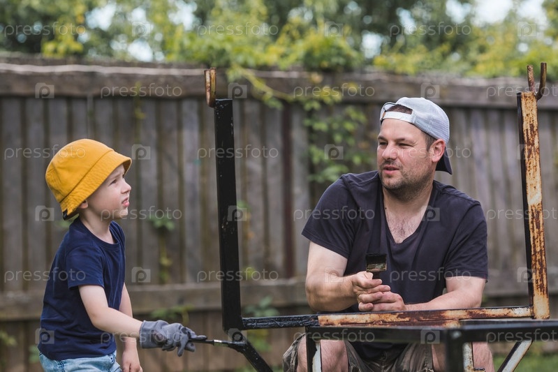 Отец и сын работают кистью и наносят черную краску на ржавчину. Люди красят металлические конструкции. Удаление ржавчины. Приучаем ребенка к работе