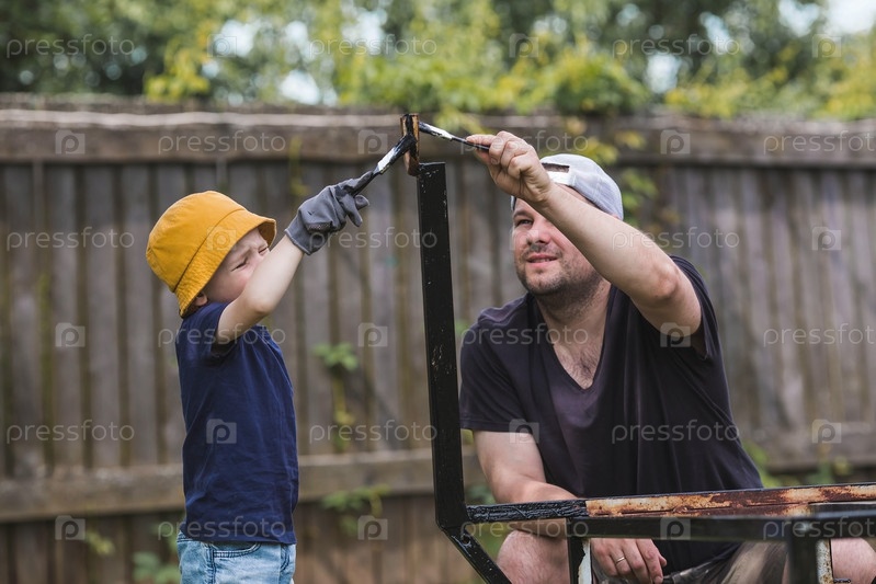 Отец и сын работают кистью и наносят черную краску на ржавчину. Люди красят металлические конструкции. Удаление ржавчины. Приучаем ребенка к работе