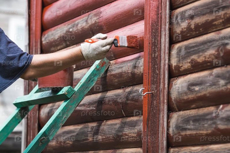 Мужчина работает кистью и наносит красную краску на деревянный деревенский дом. Рабочий красит деревянные доски крупным планом. Половина окрашенной поверхности. Размазывание кистью