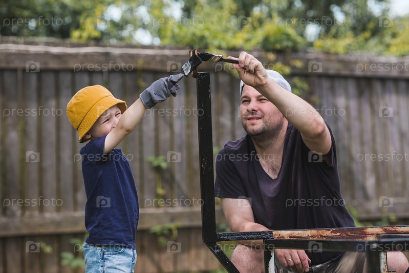 Отец и сын работают кистью и наносят черную краску на ржавчину. Люди красят металлические конструкции. Удаление ржавчины. Приучаем ребенка к работе