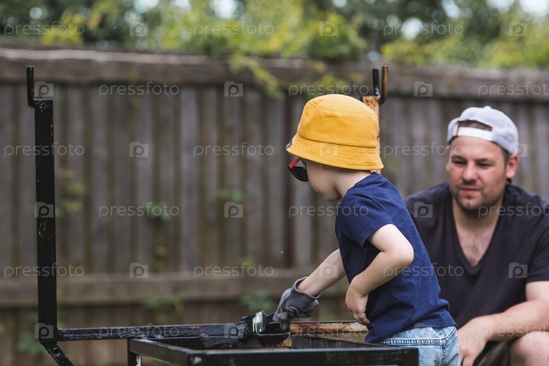 Отец и сын работают кистью и наносят черную краску на ржавчину. Люди красят металлические конструкции. Удаление ржавчины. Приучаем ребенка к работе