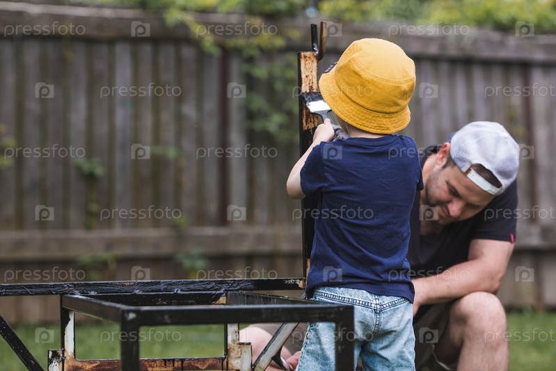 Отец и сын работают кистью и наносят черную краску на ржавчину. Люди красят металлические конструкции. Удаление ржавчины. Приучаем ребенка к работе