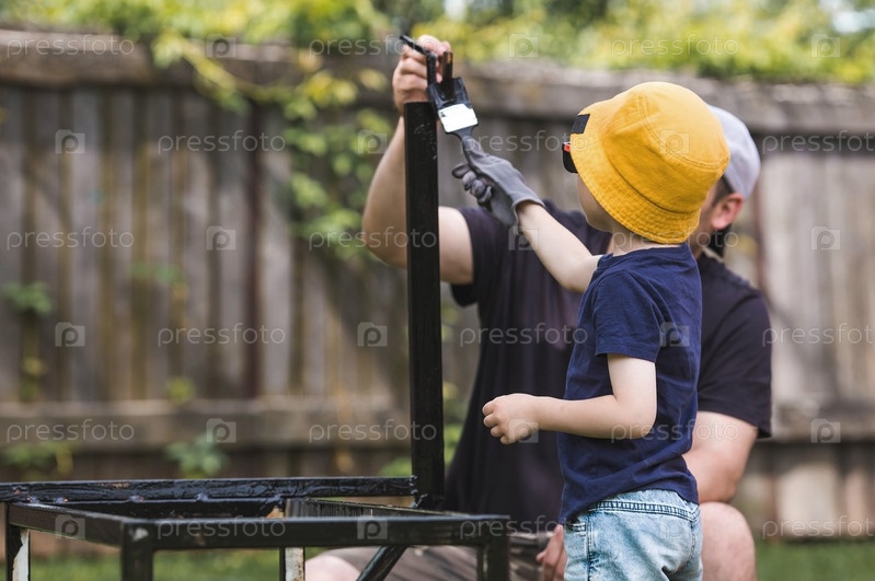 Отец и сын работают кистью и наносят черную краску на ржавчину. Люди красят металлические конструкции. Удаление ржавчины. Приучаем ребенка к работе