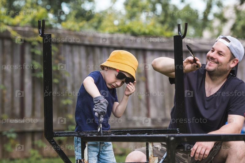 Отец и сын работают кистью и наносят черную краску на ржавчину. Люди красят металлические конструкции. Удаление ржавчины. Приучаем ребенка к работе