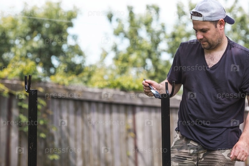 Мужчина работает кистью и наносит на ржавчину черную краску. Рабочий красит металлические конструкции крупным планом. Удаление ржавчины. Половина окрашенной поверхности. Размазывание кистью