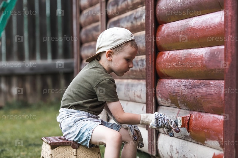 Маленький мальчик работает кистью и наносит красную краску на деревянный деревенский дом. Приучаем ребенка к работе. Половина окрашенной поверхности. Размазывание кистью