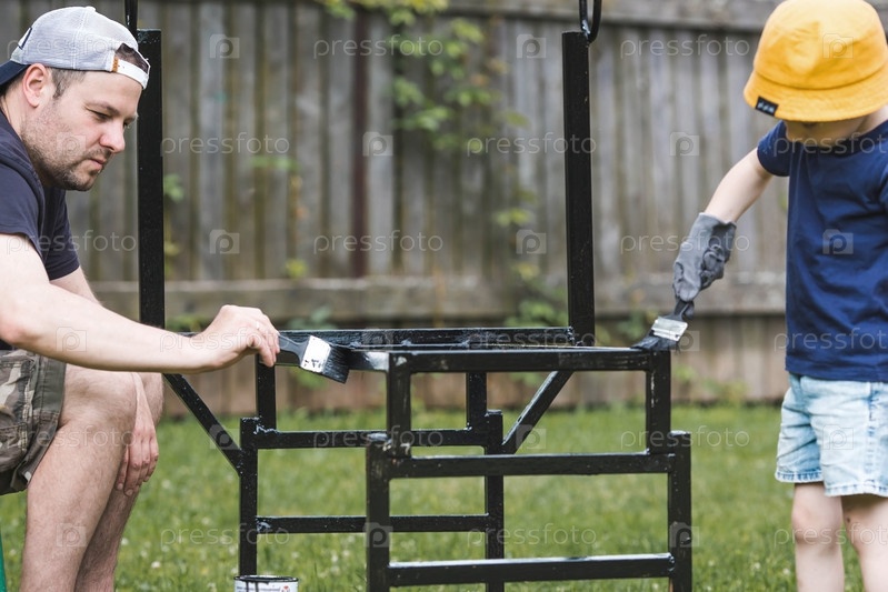 Отец и сын работают кистью и наносят черную краску на ржавчину. Люди красят металлические конструкции. Удаление ржавчины. Приучаем ребенка к работе