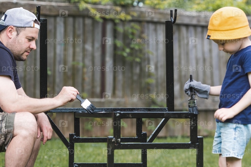 Отец и сын работают кистью и наносят черную краску на ржавчину. Люди красят металлические конструкции. Удаление ржавчины. Приучаем ребенка к работе