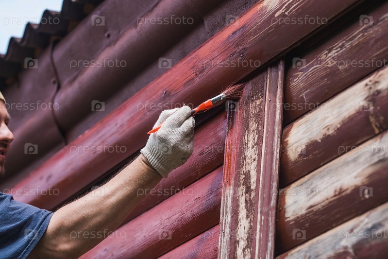 Мужчина работает кистью и наносит красную краску на деревянный деревенский дом. Рабочий красит деревянные доски крупным планом. Половина окрашенной поверхности. Размазывание кистью