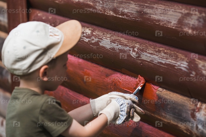 Маленький мальчик работает кистью и наносит красную краску на деревянный деревенский дом. Приучаем ребенка к работе. Половина окрашенной поверхности. Размазывание кистью