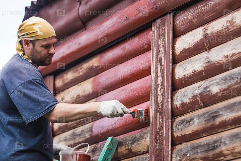 Мужчина работает кистью и наносит красную краску на деревянный деревенский дом. Рабочий красит деревянные доски крупным планом. Половина окрашенной поверхности. Размазывание кистью