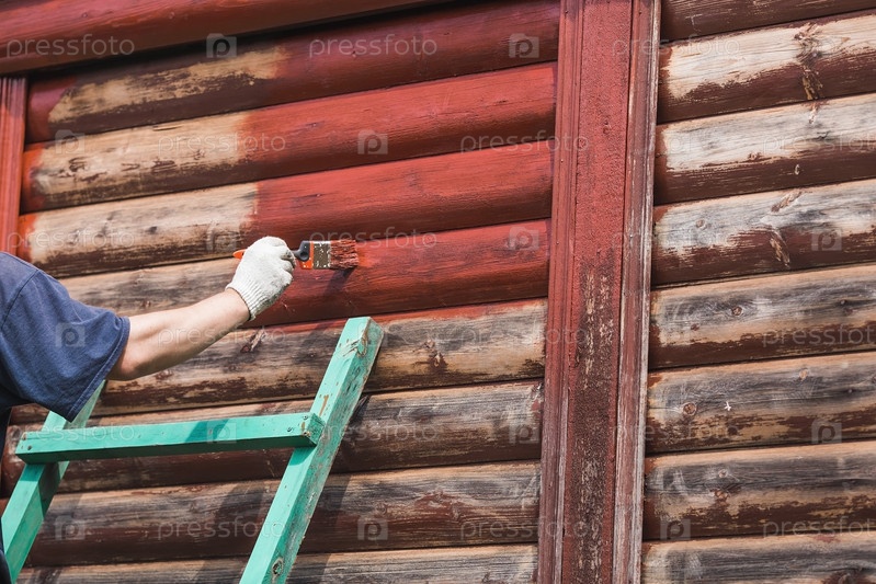 Мужчина работает кистью и наносит красную краску на деревянный деревенский дом. Рабочий красит деревянные доски крупным планом. Половина окрашенной поверхности. Размазывание кистью