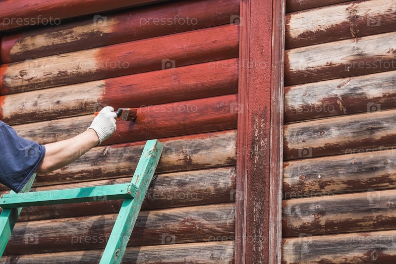 Мужчина работает кистью и наносит красную краску на деревянный деревенский дом. Рабочий красит деревянные доски крупным планом. Половина окрашенной поверхности. Размазывание кистью