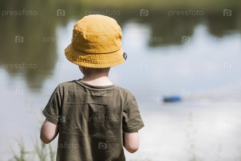 Пятилетний мальчик в желтой панамке спускает на воду радиоуправляемую лодку. Детские забавы и уличные игры. Детский досуг