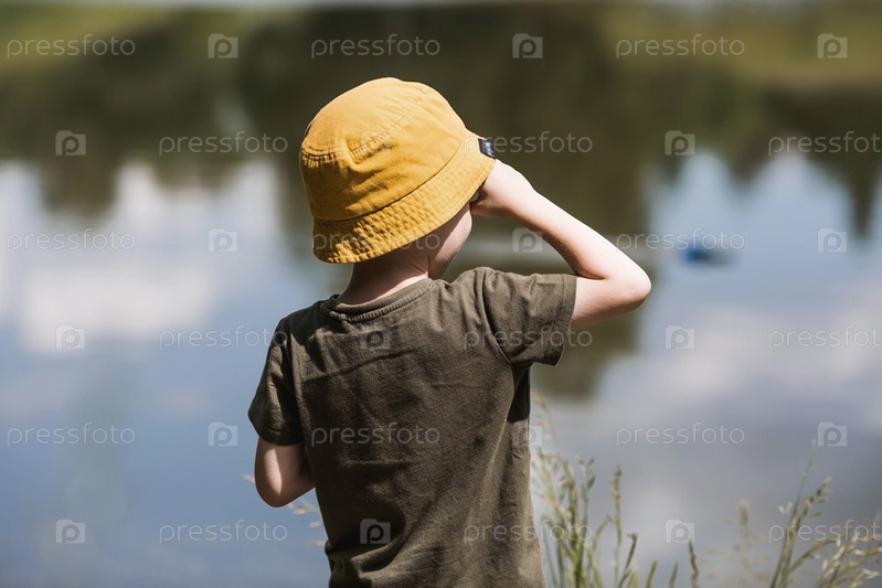 Пятилетний мальчик в желтой панамке спускает на воду радиоуправляемую лодку. Детские забавы и уличные игры. Детский досуг