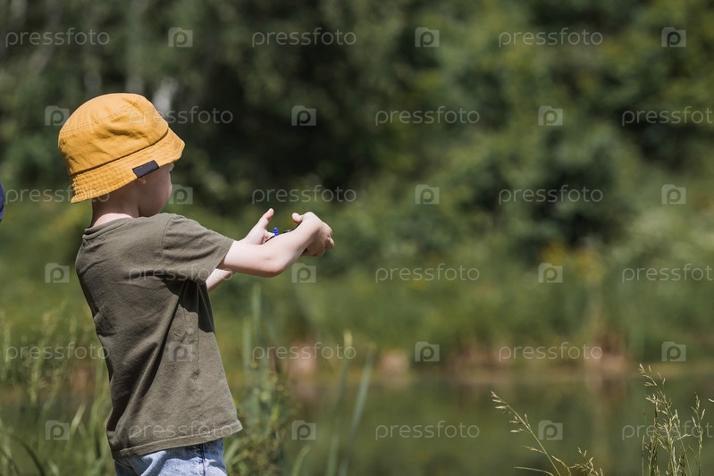 Пятилетний мальчик в желтой панамке спускает на воду радиоуправляемую лодку. Детские забавы и уличные игры. Детский досуг