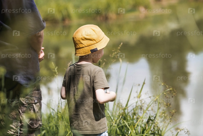 Пятилетний мальчик в желтой панамке спускает на воду радиоуправляемую лодку. Детские забавы и уличные игры. Детский досуг