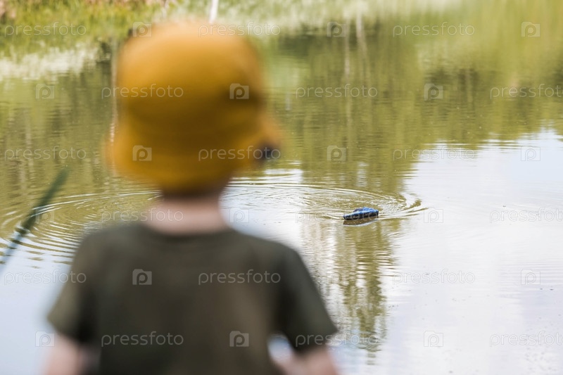 Пятилетний мальчик в желтой панамке спускает на воду радиоуправляемую лодку. Детские забавы и уличные игры. Детский досуг