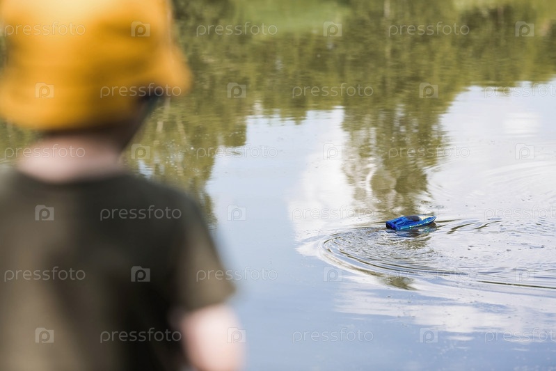 Пятилетний мальчик в желтой панамке спускает на воду радиоуправляемую лодку. Детские забавы и уличные игры. Детский досуг