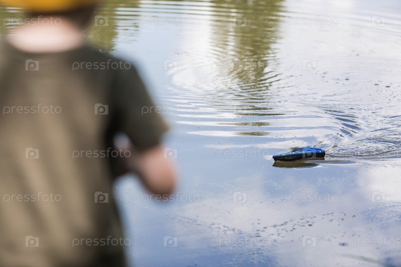 Пятилетний мальчик в желтой панамке спускает на воду радиоуправляемую лодку. Детские забавы и уличные игры. Детский досуг