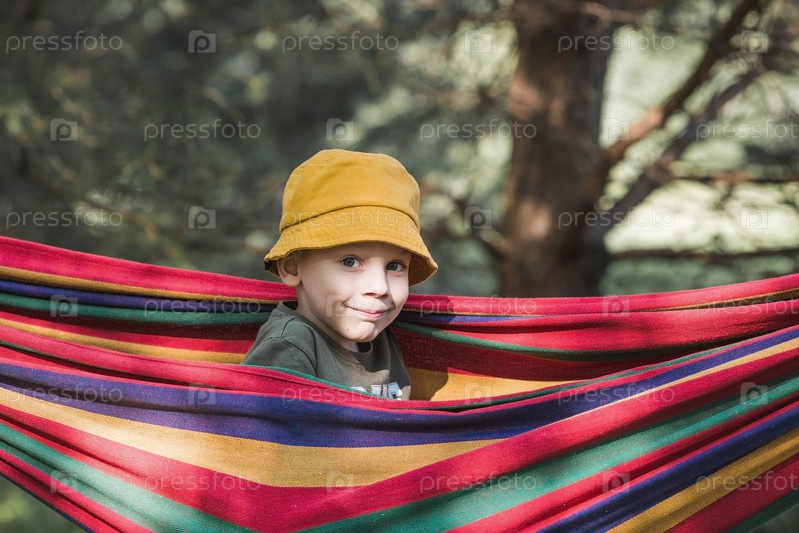 Летние каникулы для детей на свежем воздухе. Милый маленький мальчик веселится в красочном гамаке на заднем дворе. Ребенок в гамаке