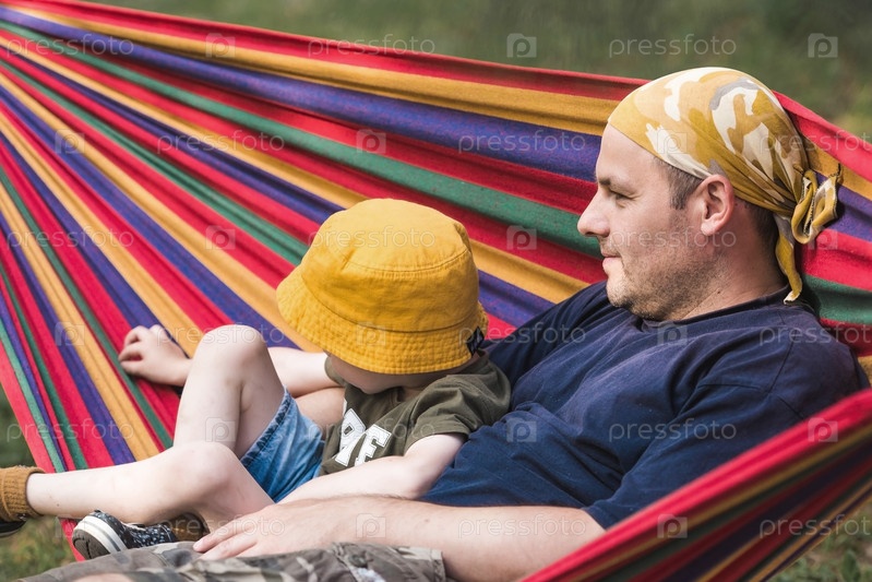 Летний отдых для детей на свежем воздухе. Милый маленький мальчик со своим отцом веселится в гамаке на заднем дворе. Ребенок и папа в гамаке