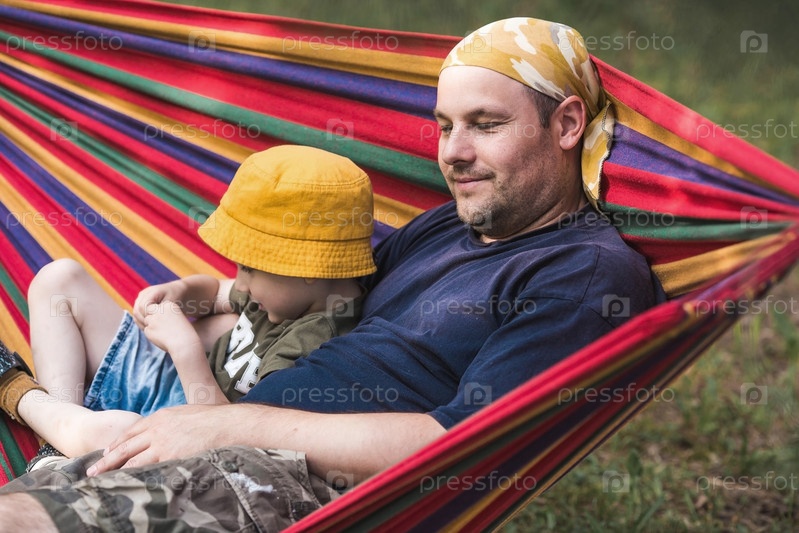 Летний отдых для детей на свежем воздухе. Милый маленький мальчик со своим отцом веселится в гамаке на заднем дворе. Ребенок и папа в гамаке