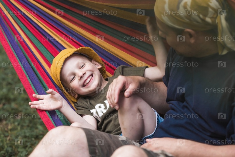 Летний отдых для детей на свежем воздухе. Милый маленький мальчик со своим отцом веселится в гамаке на заднем дворе. Ребенок и папа в гамаке