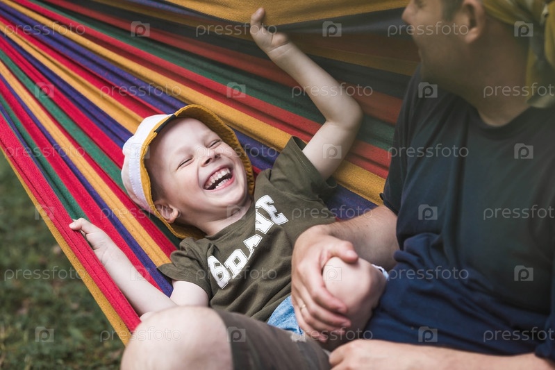 Летний отдых для детей на свежем воздухе. Милый маленький мальчик со своим отцом веселится в гамаке на заднем дворе. Ребенок и папа в гамаке