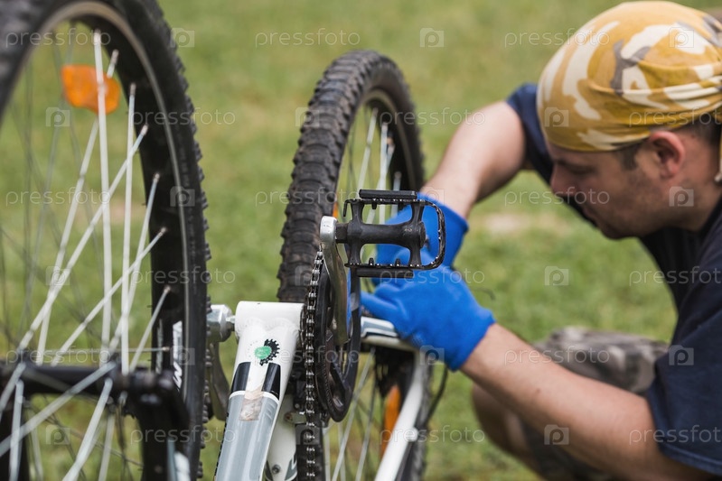 Механик-мужчина отрегулирует заднюю коробку передач и отремонтирует велосипед. Концепция обслуживания и ремонта велосипедов