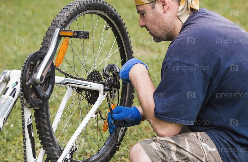 Механик-мужчина отрегулирует заднюю коробку передач и отремонтирует велосипед. Концепция обслуживания и ремонта велосипедов