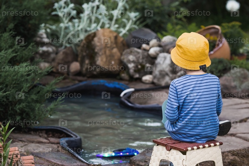 Пятилетний мальчик в желтой панамке спускает на воду радиоуправляемую лодку. Детские забавы и уличные игры. Детский досуг