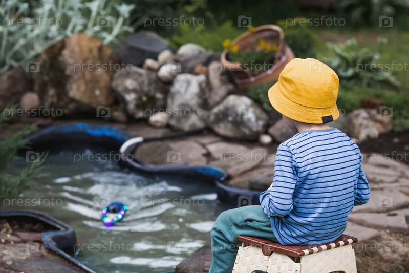 Пятилетний мальчик в желтой панамке спускает на воду радиоуправляемую лодку. Детские забавы и уличные игры. Детский досуг