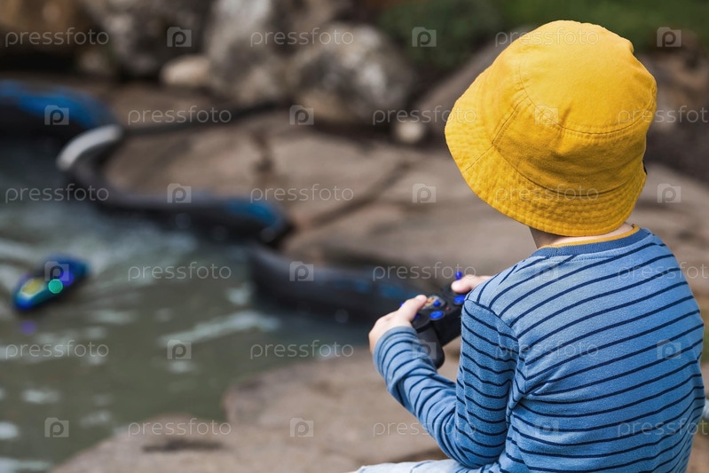 Пятилетний мальчик в желтой панамке спускает на воду радиоуправляемую лодку. Детские забавы и уличные игры. Детский досуг