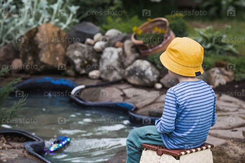Пятилетний мальчик в желтой панамке спускает на воду радиоуправляемую лодку. Детские забавы и уличные игры. Детский досуг